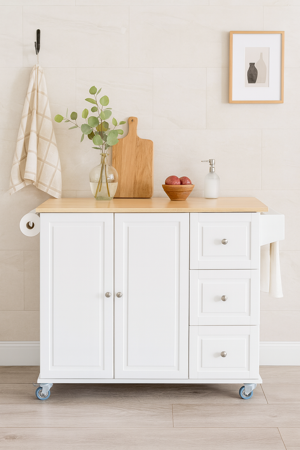 You can organize your belongings with three large drawers, a two-door cabinet, and a large spice rack on the side. A drop-leaf countertop can also be expanded or collapsed to accommodate a larger counter space or to make it smaller for easy storage. The kitchen cart has four universal rubber wheels, two of which have brakes, giving it a lot of mobility to move around without making a lot of noise and to stop quickly. A removable towel bar on the side of the kitchen cart can be used to conveniently place towels and dishes while also serving as a handle for easy cart control.