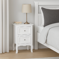 This two-drawer nightstand is constructed from high-quality MDF with a painted finish, making it solid and durable. It complements many types of interior design and furniture. The classic retro style can offer beauty and charm to a space. With two large-capacity drawers, you can store your bedside necessities and keep the room neat.