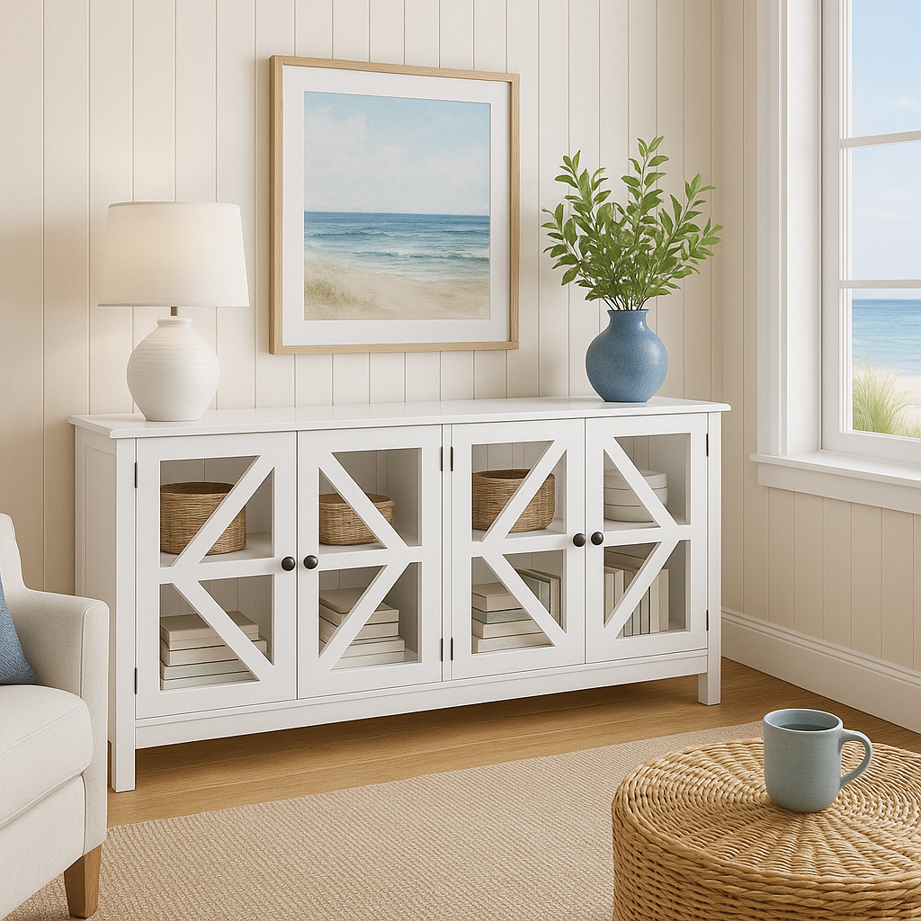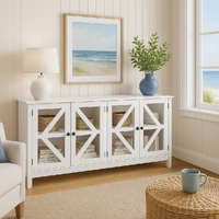 Combining a traditional and refined style, the Hamptons Buffet Sideboard exudes a rustic, laid-back beach vibe. Books, board games, barware, and dinnerware are just some of the things that could be stored in this server's two cabinets, each of which has an adjustable shelf inside. Glass doors with barn-inspired overlays draw attention to the contents of the piece while also enhancing its country aesthetic. One of the main features of this sideboard is that it has a lot of surface space that may be used for setting out buffet dishes or display items.