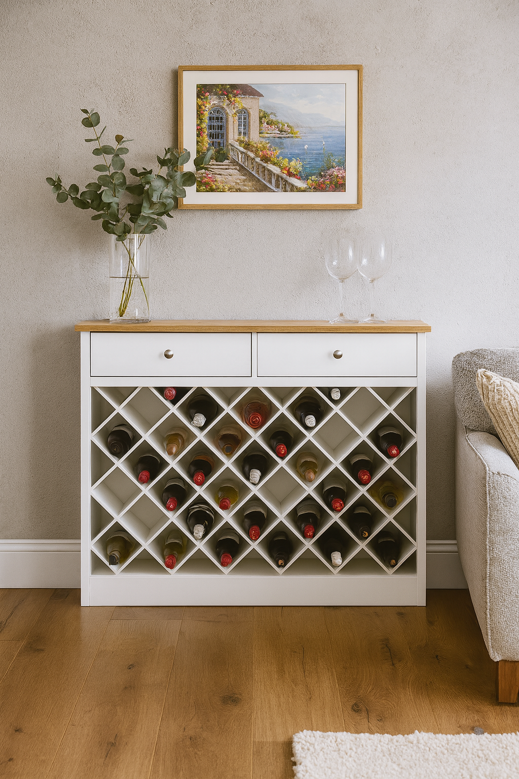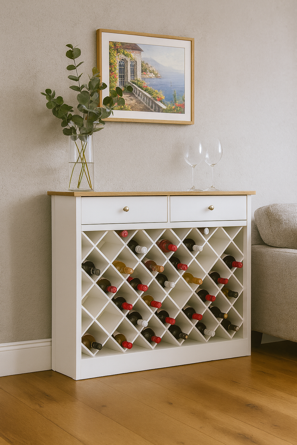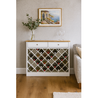 This elegant white wine rack cabinet is a graceful fusion of functionality and style for the wine enthusiast's abode. Crafted with precision and finesse, this wine rack seamlessly blends into any modern or classic decor, elevating your space with its timeless appeal.